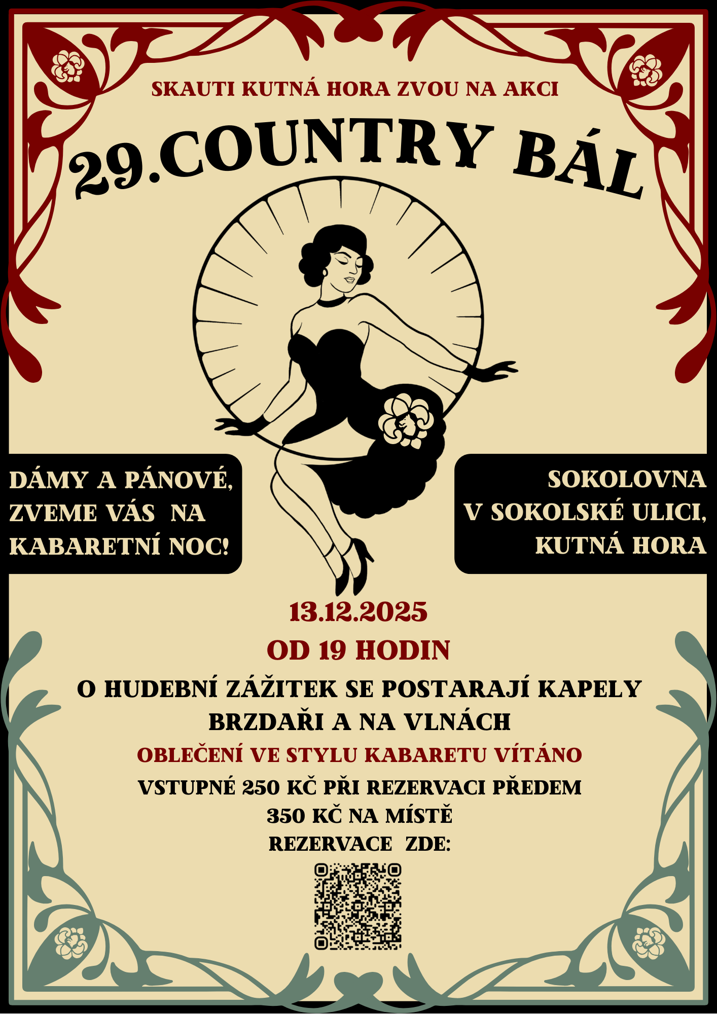 Srdečně zveme na již 29. tradiční prosincový Country bál opět v režii kutnohorských skautů. Kromě tance, k němuž zahrají kutnohorské kapely Brzdaři a Na vlnách, se můžete těšit i na rozličné westernově-plesové disciplíny a atmosféru divokého západu. Odění ve stylu country vítáno (ale není podmínkou).
