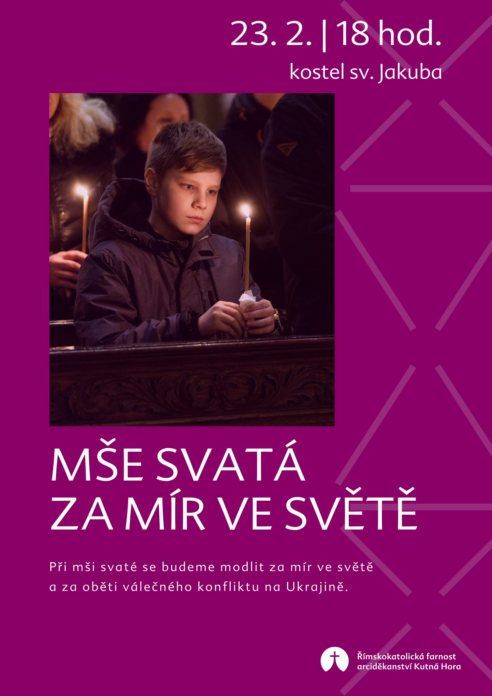 Dva roky od začátku ruské invaze na Ukrajinu zveme všechny lidi dobré vůle ke společné modlitbě za mír a za oběti nejen této války. Mši svatou na tento úmysl budeme slavit v pátek 23. února od 18:00 v kostele svatého Jakuba v Kutné Hoře. Mši bude předsedat kutnohorský arciděkan, P. Vladislav Brokeš.